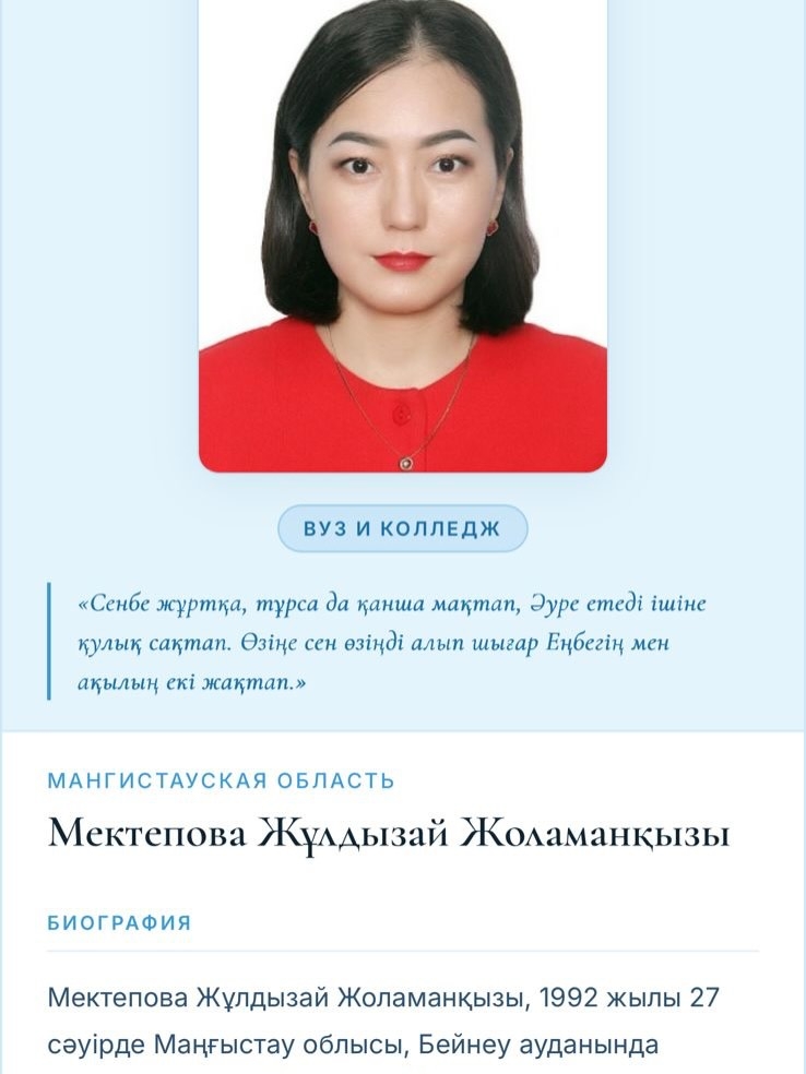 «Қазақстан ғылымындағы әйелдер» виртуалды галереясында Нұрлыхан Бекбосынов атындағы Маңғыстау энергетикалық колледжінің информатика пәнінің оқытушысы Мектепова Жұлдызай Жоламанқызы бар. Әріптесіміздің бұл виртуалды галереяға енгізілуі – оның білім мен ғылым саласындағы еңбегінің, кәсіби шеберлігі мен қоғамдағы белсенді қызметінің дәлелі.