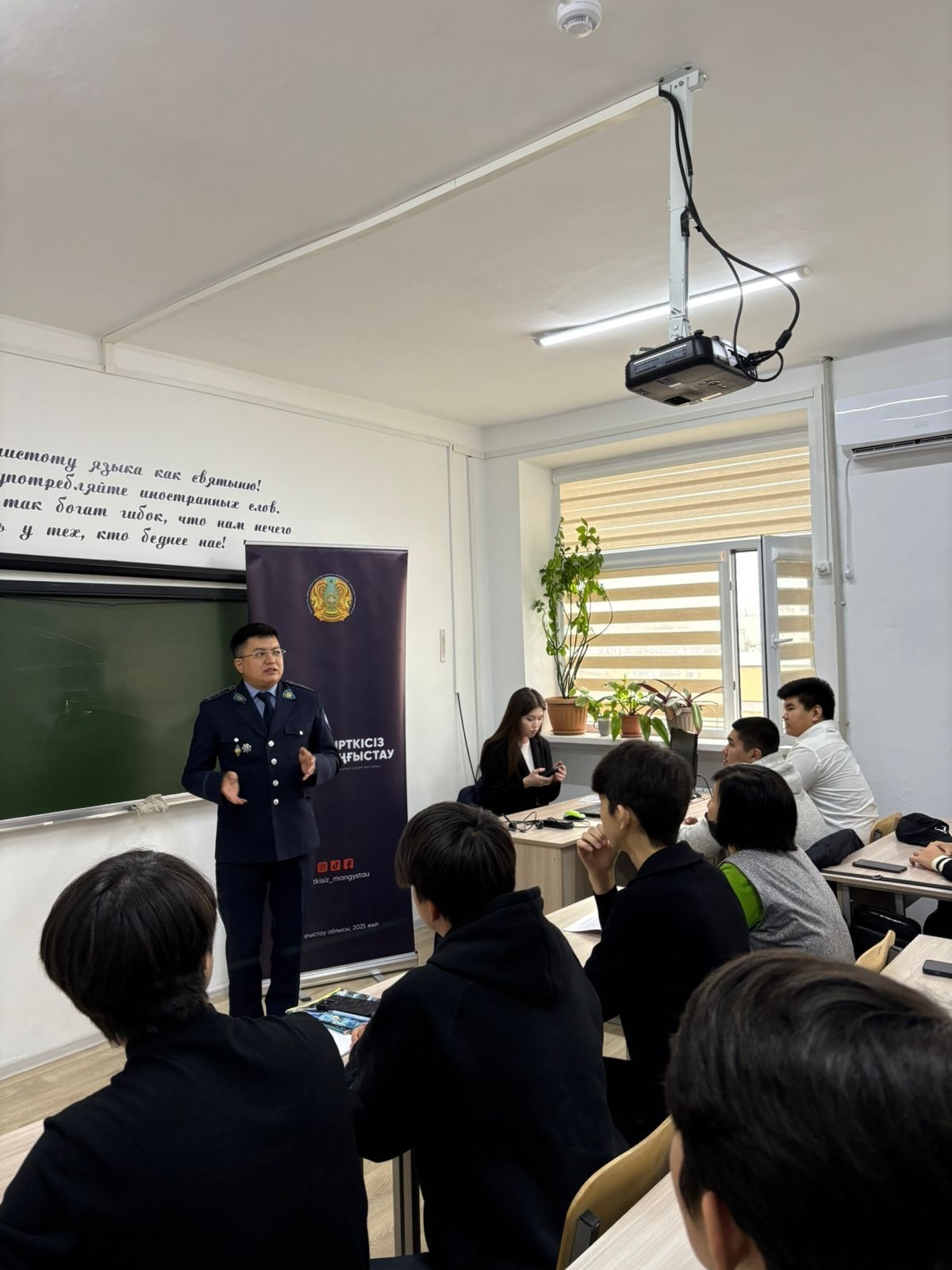 Облыстық салауатты өмір салтын қалыптастыру орталығының ұйымдастыруымен Маңғыстау облыстық Полиция департаментінің Есірткі қылмысына қарсы іс-қимыл басқармасының жедел уәкілі, полиция капитаны А. Зиноллиннің қатысуымен колледж студенттеріне ақпараттық кездесу өткізілді.